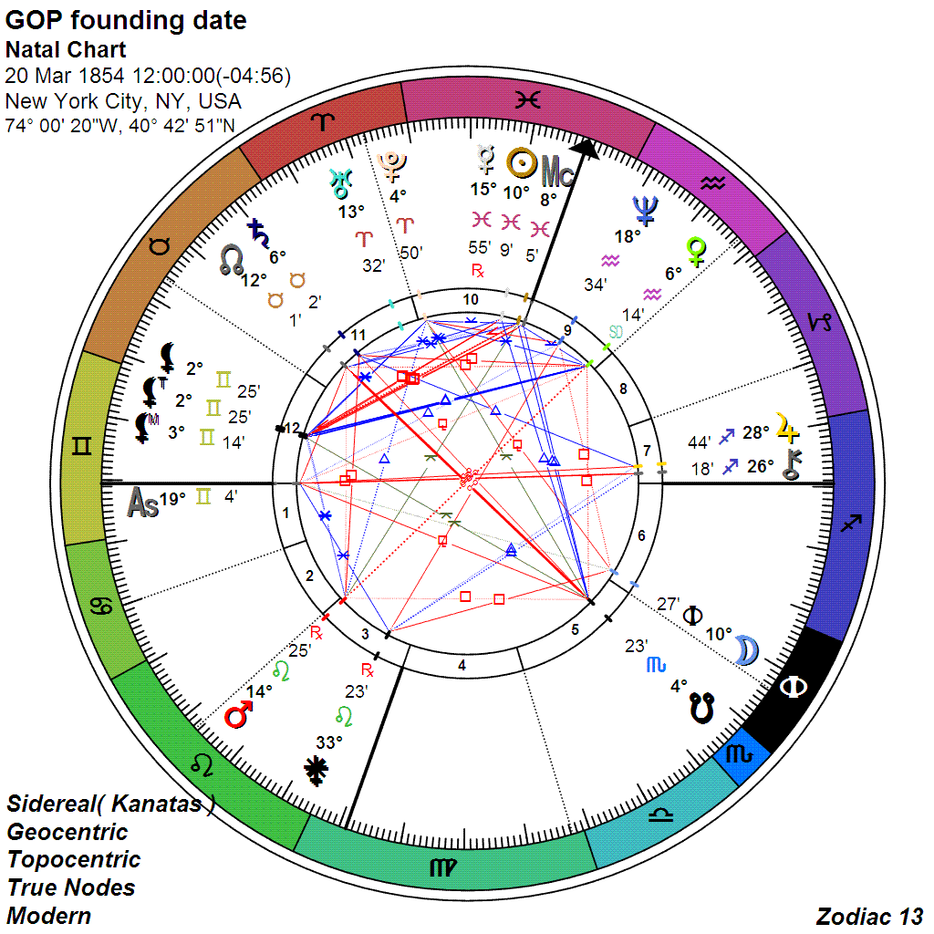 The Republican Party was a progressive party at its birth in 1854. It emerged as an alternative to the corrupt, pro-South, pro-slavery Democratic party. Its natal Sun and Mercury in Pisces is an confirmation that it was founded by anti-slavery activists. The main thrust of its founding principles was the support of the Free State of Kansas, which had been invaded by gangs of terrorists ("invaders") from the slave owning states and was going to be annexed by the South. The Republicans reaffirmed the access of the Kansas citizens to their constitutional rights as defined by the constitution. Republican ideology was reflected in the 1856 slogan "free labor, free land, free men"