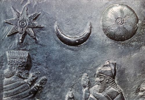 Assyrian depiction of the eight pointed star of Venus, right, the Moon and Solar disk, left, with its four axes and four intercalated solar rays [source]