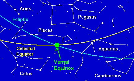 This point is slowly moving along the yellow line from Pisces to Aquarius. This takes approximately 2600 years. That explains why our spring is earlier today then it was in Ancient Rome.
