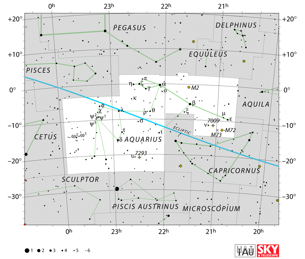 "The stars in the Aquarius constellation can be interpreted as resembling the figure of a man holding a bucket with a pouring stream of water. The constellation Crater is often referred to as his cup. In Babylonian astronomy books, Aquarius is called "GU.LA" or "The Great One" and identified with the god Ea, the ruler of the southern quarter of the Sun's path, the "Way of Ea." In the Hindu zodiac, Aquarius is called "kumbha," which also means "water-pitcher." The Aquarius constellation occupies an area of 980 square degrees and contains five stars with known planets. It can be seen at latitudes between +65° and -90° and is best visible at 9 p.m. during the month of October. The constellation lies in the region sometimes referred to as the Sea, or the Water, an area occupied by many water-related constellations, including Cetus (the Whale),Delphinus (the Dolphin), Eridanus (the Great River) and Pisces (the Fish). In sidereal astrology, the Sun passes through Aquarius from mid-February to mid-March. In popular (tropical) astrology, the Sun is considered to pass through Aquarius from January 20 to February 18. The brightest star in the Aquarius constellation is [264], beta Aquarii, also known by its traditional name Sadalsuud. The name derives from the Arabic phrase "sa’d al-suud," meaning "luck of lucks." Beta Aquarii has a magnitude of 2.9 and lies 610 light-years from Earth. It is classified as one of the rare yellow supergiants."