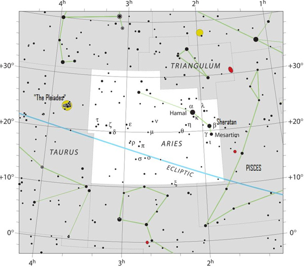 The constellation Aries has five stars with known planets and contains no Messier objects. There are several well known meteor showers connected to this constellation: the May Arietids, Autumn Arietids, Delta Arietids, Epsilon Arietids, Daytime-Arietids, and Aries-Triangulids. Hamal is the brightest star in the constellation Aries and the 48th brightest star in the night sky. It is a K-type orange giant about twice as massive as the Sun, with an apparent visual magnitude varying between 1.98 and 2.04. Between 2000 and 100 BC, Hamal was located at the vernal equinox, the point that marks the beginning of spring. The name Hamal means lamb and derives from the Arabic phrase rās al-ħamal, meaning “head of the ram."