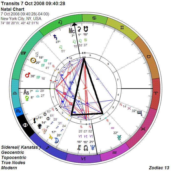 During the Yod's stressful spike of energy, the drug of ego and paper wealth clashed with reality, suddenly the inadequacy of the banks was revealed. Neptune in Capricorn was laying along the Moon's Nodes and cuts the Yod in half. The pride and arrogance of the market was exposed, and the Yod was a warning that a bear market had started. The computers showed only unrecoverable debt and collapsing real estate values.
