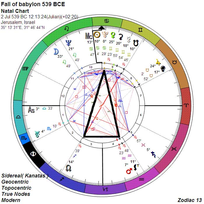 Cyrus took Babylon in a near-peaceful regime change. That's the meaning of the Sagittarius North node on the left point of this Yod. With Mars in Aquarius on the right handle of the Yod, Cyrus acted with political maturity and enlightened leadership by not sacking Babylon and slaughtering or enslaving its inhabitants, as most conquering armies would have customarily done.