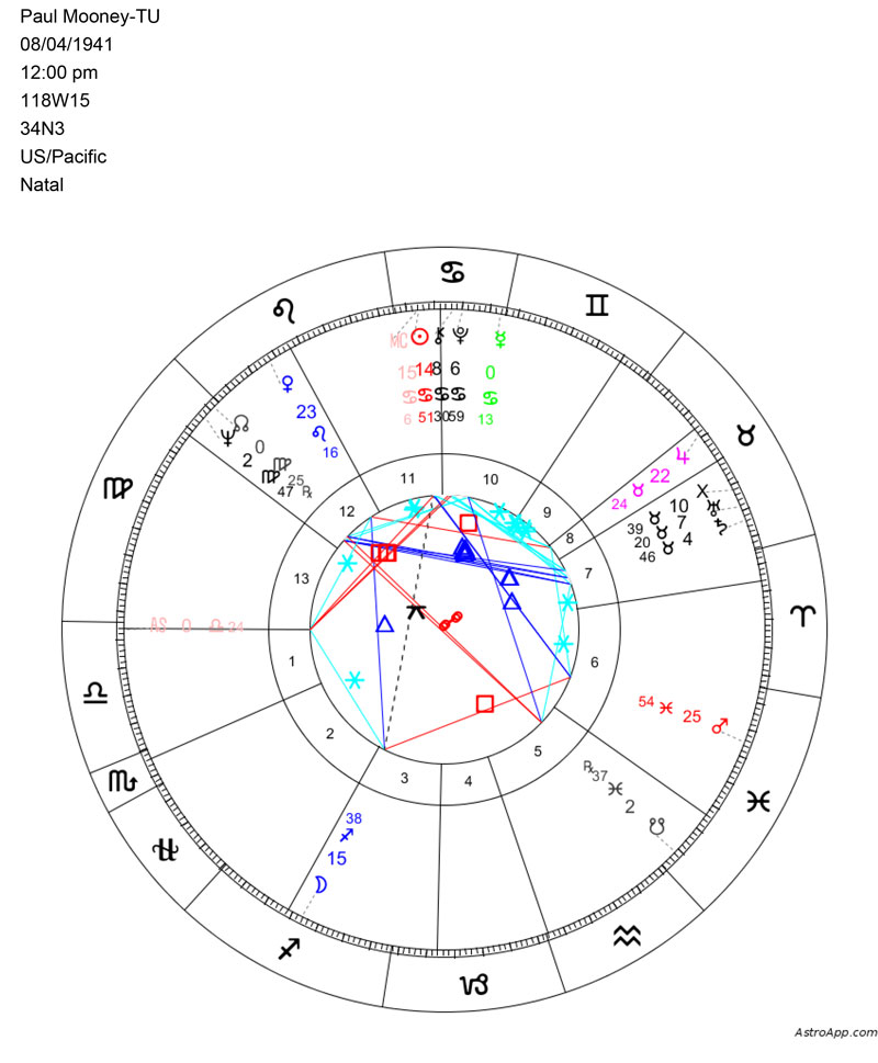 Mooney’s Sagittarius Moon has forced him to quest for higher knowledge, to say things that no-one dares to say. He's a hero to the African American community. Paul Mooney’s Venus is in Leo, which is why he is like a big cat in front of his audience. Preening like a well-oiled eunuch, or Genii, he skewers hypocrasy and dares his audience not to laugh. He chuckles, "I've still got it", when white people storm out of his shows. He ridicules the politically correct double standard. “White people will throw a baby into a dumpster and run away, but stop traffic all day if a puppy gets lost on the road”